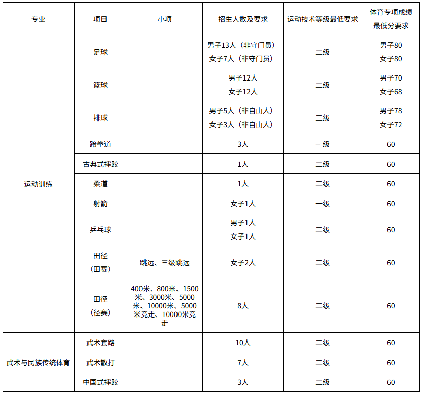 运动训练专业本科招生70名,武术与民族传统体育专业本科招生20名。